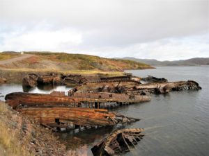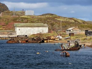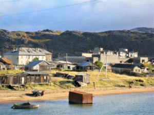 Als we weer verder rijden komen we bij het volgende dorpje aan. Ook dit dorp geeft een verlaten en verwaarloosde indruk maar nu zien we vrij snel mensen buiten staan. Volgens de GPS zou dit dorpje aan de Barentszzee moeten liggen. We rijden door het dorp en al gauw zien we de Barentszzee voor ons, wat een uitzicht! Prachtige steile kliffen waar de zee tegen aan bonkt. Van hier is het nog slechts 650 km hemelsbreed naar Nova Zembla.
