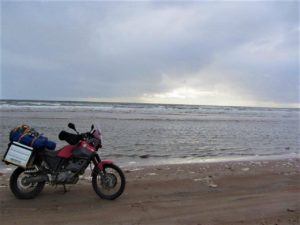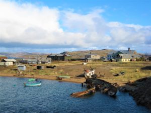 De volgende dag gaan we op pad en na ongeveer 130 km gravel komen we aan in een oud vissersdorp. Het lijkt er verlaten, alles is oud en vervallen. We zien oude communistische flats die verlaten lijken maar waar her en der toch nog satellietschotels hangen. Een teken dat er toch mensen moeten wonen. Na ongeveer 10 min zien we dan ook wat mensen lopen en besluiten we om verder te rijden. We komen uit bij een strandje waar heel veel boten in het water liggen die zijn vergaan.