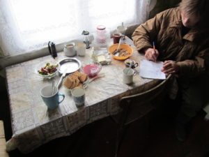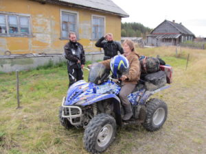 Als we terug rijden komen we door een oud dorpje waar we al eerder door waren gereden, maar nu besluiten we om even stil te staan, om een paar foto’s te maken voor in ons plakboek. Het lijkt weer uitgestorven maar na een poosje komt er een vrouwtje op ons af en bekijkt onze motoren. Ze nodigt ons uit in haar huis en al snel zitten we in haar kleine keukentje en gaan we terug in de tijd. De houtkachel brand volop en hebben het er bloedheet! Als we net zitten begint de vrouw van alles klaar te zetten op de tafel. Brood, kaas, jam, koekjes en zelfs chocolade snoepjes worden voor ons uitgestald. Als we na een plak brood met kaas en warme thee aangeven weer verder te willen, wil de vrouw nog 1 ding; ze wil op de quad zitten! Hierna rijden we verder richting Umba.