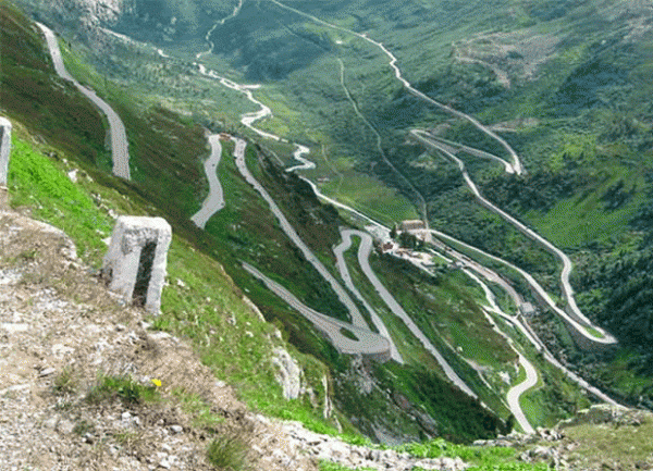 De pas is een van de hoogste verharde wegen in de Alpen. Aan de oostzijde is er in 26 kilometer een hoogteverschil van 1.846 meter met een stijgingspercentage van 7.7%. Echt gevaarlijk is de weg niet, zolang je goed haarspeldbochten kan rijden, want daar kom je er 48 van tegen!