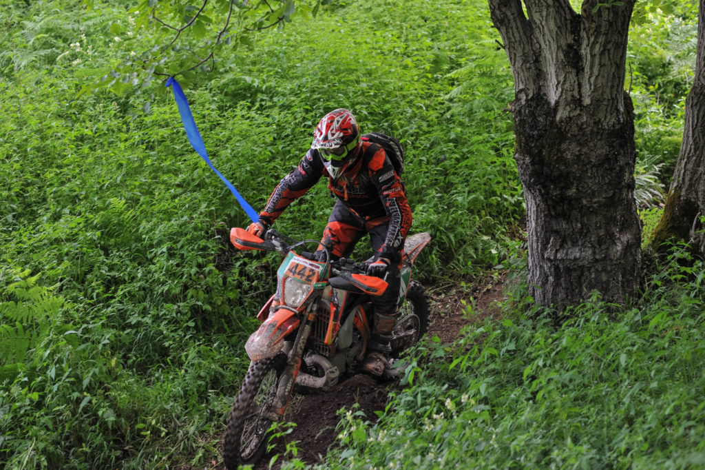 Aangekomen bij het SP zat ik er helemaal doorheen, mentaal maar ook fysiek. Ik kon geen hap door mijn keel krijgen. In de 20 min. die je bij het SP hebt, mezelf weer bij elkaar geraapt om weer door te gaan. Gelukkig ging het daarna wel beter als in de ochtend maar als snel zag ik in de verte een gitzwarte lucht. Het duurde 20 min. nadat ik was weggereden bij het SP toen de hel los barste. Het stortregende en het begon te onweren. In het bos werd het pikke donker en zag je geen hand voor ogen, behalve tijdens een licht flits. Alles werd 1 grote glij partij. De afdaling was geen afdaling meer maar een modder stroom. Deze ging op een gegeven moment zelfs harder dan mij naar beneden! Mijn voorwiel en achterwiel blokkeerden regelmatig en het werd een grote glijpartij. Het was nu alleen maar vallen en opstaan, weer vallen, motor oppakken, wat verder glijden, vallen, weer je motor oppakken en weer wat verder glijden. Na deze hele lange afdaling moesten we op een gegeven moment een bochtje naar links maken en was blij dat ik lampen zag van de finish. Echter toen we uit het bos kwamen waren het 2 koplampen van een auto en moesten we nog weer verder!