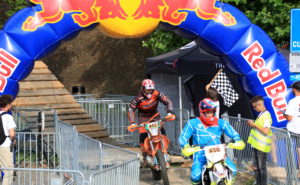 Na een afbuiging naar rechts dacht ik onderaan de berg te zijn maar niks was minder waar. De afdaling ging gewoon nog verder! De moed zakte me in de schoenen. Er was bijna geen doorkomen aan, we stonden in file vast! We moesten over een paar dikke wortels heen maar mijn achterwiel zakte weg toen ik er overheen wilde. Ik had de kracht niet meer om de motor op te beuren. Achter mij stond volgens mij een Spanjaard die ik vroeg of hij me wilde helpen. Zijn antwoord was ‘zo meteen’ en hing daarna over zijn stuur om uit te rusten. Nadat we elkaar hadden geholpen gingen we weer glibberend verder. We kwamen uit bij een zelf gemaakt bruggetje met daarachter de Red Bull Romaniacs boog, de finish! Ik kwam aan, meer dood dan levend en helaas was ik 10 min te laat binnen. Tijdens het wachten bij de finish hoorde Carolien van rijders van de zilver klasse dat de afdaling ‘verry dangerous’ en ‘not do-able’ was. Het was inderdaad niet te doen en we moesten nog een dag!