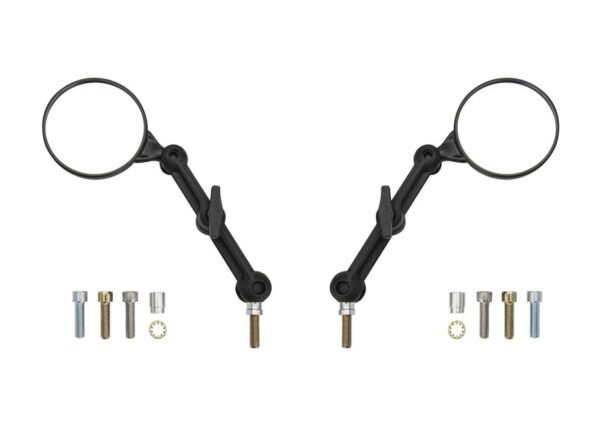 De DoubleTake Mirrors Dual Sport Kit is perfect voor avontuurlijke en tourmotoren, waar de spiegels meestal omhoog staan. Deze spiegel biedt het breedste gezichtsveld en is ideaal voor zowel verharde als onverharde wegen.