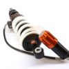 This shock absorber uses a damping shim stack specifically developed for its application. The aluminum shock absorber housing creates maximum thermal stability by optimal heat removal. Not only leads this to stable performance but also to a longer lifetime of the shock and its oil. To create the best performance for every model we use high flow pistons, low friction seals, and dedicated shimstacks. We use heavy duty components like microfinished induction hardened quenched&tempered 42CrMo 16mm piston rods, best quality bearings and stainless steel bushings. Every shock can be opened and serviced, or tuned for the customer’s application. For all shocks there is a range of springs from softer than standard till harder.