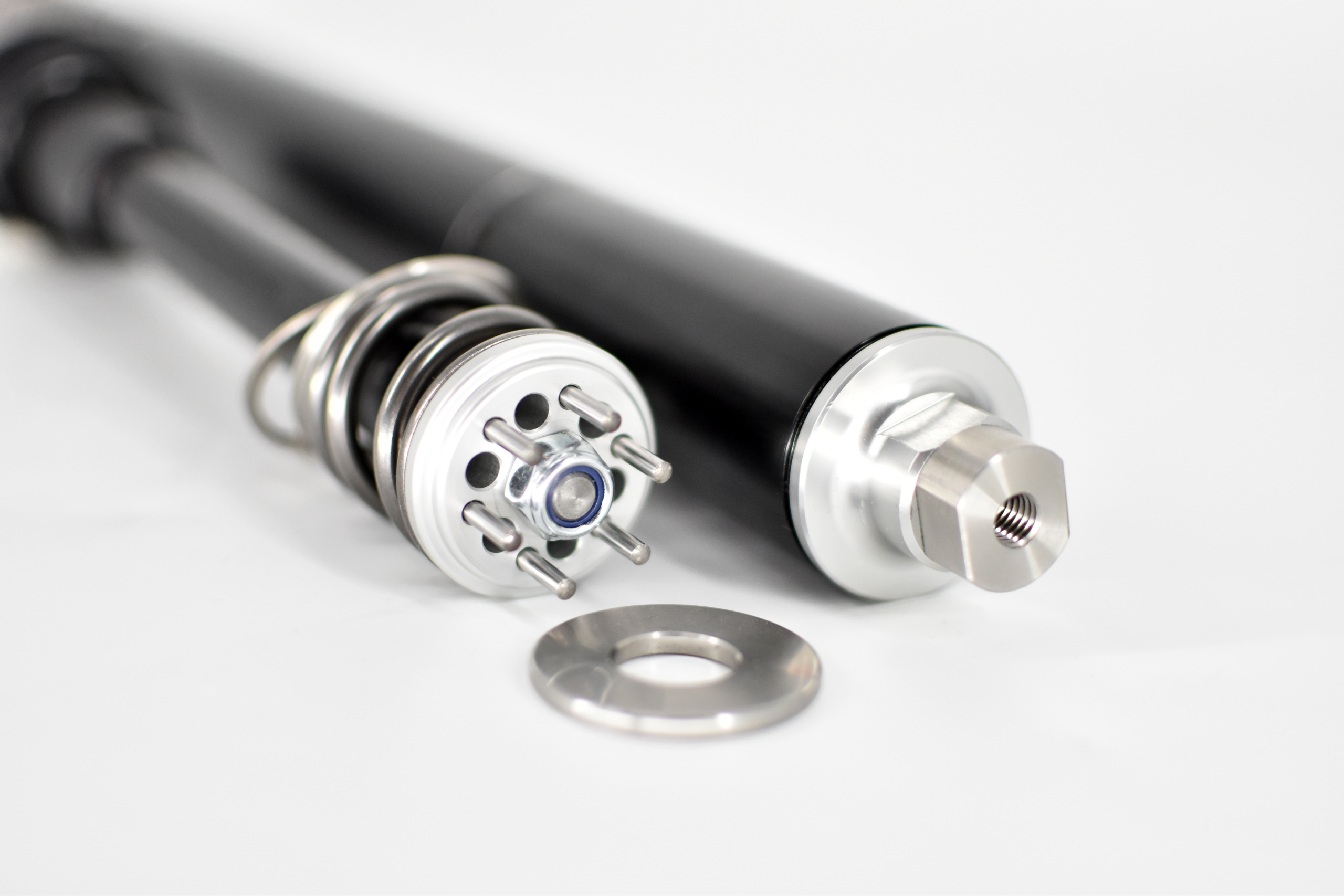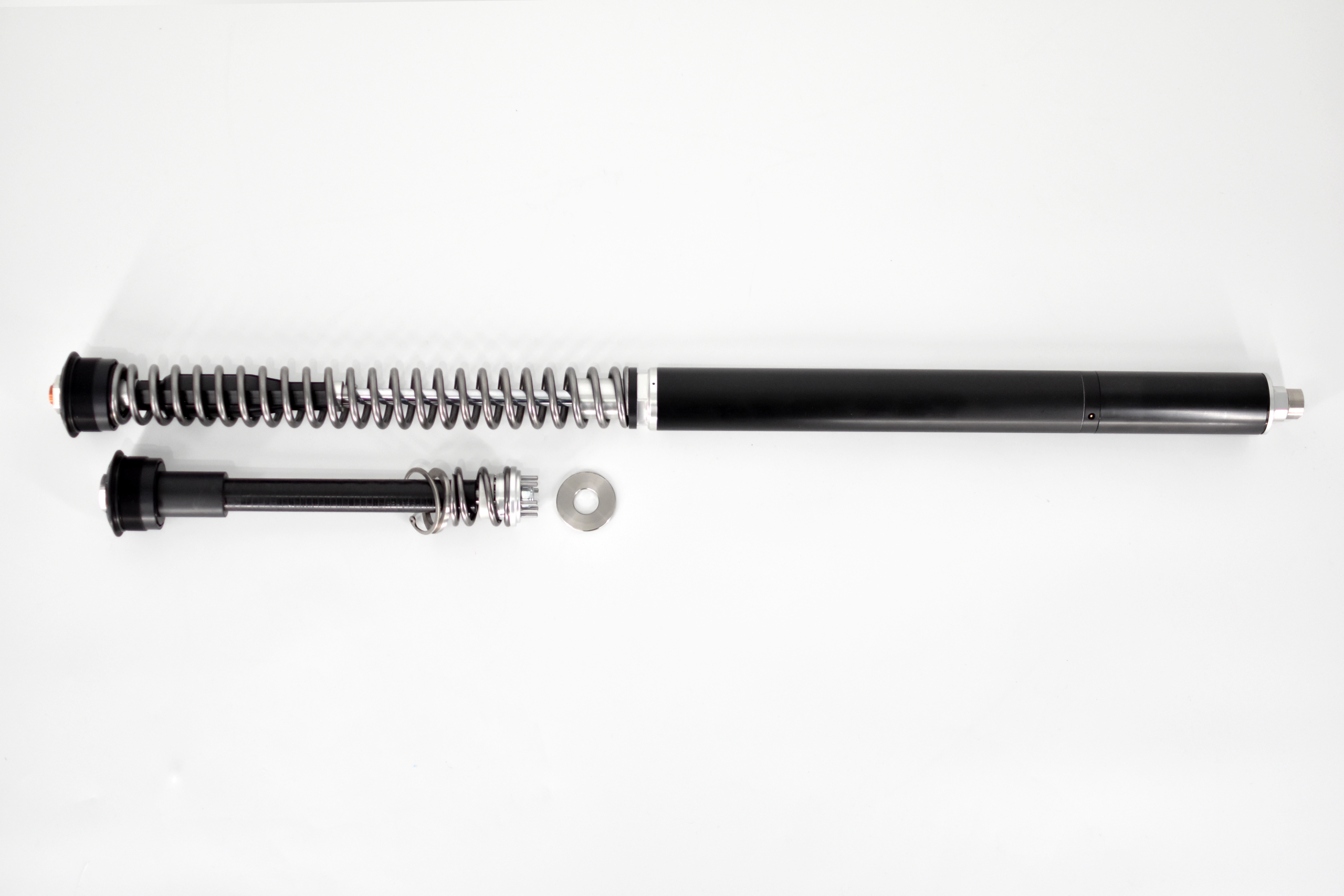 These cartridges fit right into the fork legs without modifications to the fork. The cartridges are closed, meaning that the cartridge is like a separate, pressurised shock absorber inside the fork with its own damping oil for optimal handling. The products were originally developed in close cooperation with adventure riders, world travelers and rally riders. The products have proven their value over the years: hugely improved off-road handling while retaining comfort during long travels. This is certainly also due to the huge size of piston used: 35 mm diameter. This size of piston is the largest of all aftermarket suspension providers. Apart from a high oil flow, this piston size allows for a stable, well-controlled damping behaviour. The size of the internal bore also allows to use electronic adjustments. Later on the cartridges have been further developed for use in road racing. Again the cartridge design has proven to be stable and finely adjustable. Every cartridge can be easily opened and serviced. Or the damping can be tuned for the customer’s application. Spring rate, spring preload and air chamber are easily modified, there is for every product a range of springs available pending on loading and application. Every cover cap contains a dearation screw to remove an excess of foam and air.