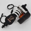 The main advantage of a damper with an external reservoir is that the shock absorber contains significantly more oil and also shows significantly more cooling surface than a shock absorber without a reservoir. It additonally offers the tuning capabilities to control the compression (ingoing) oil flow. Two separate adjusters control the damping respectivily at low shock absorber speed (slow undulations in the track/road) and at high shock absorber speed (sudden bumps or holes). The fixed piggybag fits nicely within the motorbike frame.