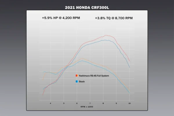 Yoshimura heeft de Yoshimura RS-4S Full Exhaust ontwikkeld voor de gloednieuwe Honda CRF300L en Rally editie, met geweldige resultaten. De Yoshimura Full Exhaust levert tot 5,9% meer maximale paardenkracht, terwijl het vermogen over het gehele bereik wordt verbeterd. Dit stelt de 286cc motor in staat om de prestaties te optimaliseren, terwijl er een aanzienlijke gewichtsbesparing wordt gerealiseerd.
