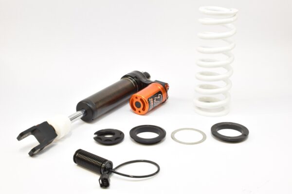 This shock absorber uses a damping shim stack specifically developed for its application. The shock absorber housing creates maximum thermal stability by optimal heat removal. Not only leads this to stable performance but also to a longer lifetime of the shock and its oil. To create the best performance for every model we use high flow pistons, low friction seals, and dedicated shimstacks. We use heavy duty components like microfinished induction hardened quenched&tempered 42CrMo 16mm piston rods, best quality bearings and stainless steel bushings. Every shock can be opened and serviced, or tuned for the customer’s application. For all shocks there is a range of springs from softer than standard till harder.