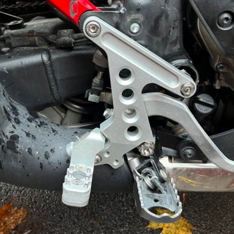 Omdat de originele voetsteunen van de CRF 1100 iets omhoog wijzen, is ook de voetsteunhellingshoek (camber angle) instelbaar, net zoals bij TwinPegs-kits voor enduro-motoren. Zo kun je de positie van je voeten volledig afstemmen op je rijstijl en comfort.