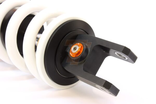 This shock absorber uses a damping shim stack specifically developed for its application. The aluminum shock absorber housing creates maximum thermal stability by optimal heat removal. Not only leads this to stable performance but also to a longer lifetime of the shock and its oil. To create the best performance for every model we use high flow pistons, low friction seals, and dedicated shimstacks. We use heavy duty components like microfinished induction hardened quenched&tempered 42CrMo 16mm piston rods, best quality bearings and stainless steel bushings. Every shock can be opened and serviced, or tuned for the customer’s application. For all shocks there is a range of springs from softer than standard till harder.