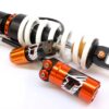 This shock absorber uses a damping shim stack specifically developed for its application. The aluminum shock absorber housing creates maximum thermal stability by optimal heat removal. Not only leads this to stable performance but also to a longer lifetime of the shock and its oil. To create the best performance for every model we use high flow pistons, low friction seals, and dedicated shimstacks. We use heavy duty components like microfinished induction hardened quenched&tempered 42CrMo 16mm piston rods, best quality bearings and stainless steel bushings. Every shock can be opened and serviced, or tuned for the customer’s application. For all shocks there is a range of springs from softer than standard till harder.
