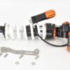 This shock absorber uses a damping shim stack specifically developed for its application. The aluminum shock absorber housing creates maximum thermal stability by optimal heat removal. Not only leads this to stable performance but also to a longer lifetime of the shock and its oil. To create the best performance for every model we use high flow pistons, low friction seals, and dedicated shimstacks. We use heavy duty components like microfinished induction hardened quenched&tempered 42CrMo 16mm piston rods, best quality bearings and stainless steel bushings. Every shock can be opened and serviced, or tuned for the customer’s application. For all shocks there is a range of springs from softer than standard till harder.