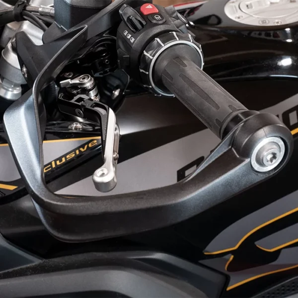 Mocht je motor omvallen, dan kan de hendel omhoog worden geklapt en wordt schade vermeden. Daarna wordt de hendel eenvoudig weer terug geklapt. Ongewenst wegklappen tijdens het rijden is onmogelijk vanwege de te grote weerstand.