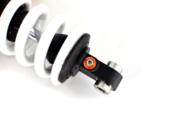 This shock absorber uses a damping shim stack specifically developed for its application. The aluminum shock absorber housing creates maximum thermal stability by optimal heat removal. Not only leads this to stable performance but also to a longer lifetime of the shock and its oil. To create the best performance for every model we use high flow pistons, low friction seals, and dedicated shimstacks. We use heavy duty components like microfinished induction hardened quenched&tempered 42CrMo 16mm piston rods, best quality bearings and stainless steel bushings. Every shock can be opened and serviced, or tuned for the customer’s application. For all shocks there is a range of springs from softer than standard till harder.
