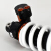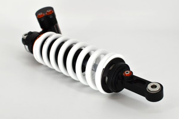 This shock absorber uses a damping shim stack specifically developed for its application. The aluminum shock absorber housing creates maximum thermal stability by optimal heat removal. Not only leads this to stable performance but also to a longer lifetime of the shock and its oil. To create the best performance for every model we use high flow pistons, low friction seals, and dedicated shimstacks. We use heavy duty components like microfinished induction hardened quenched&tempered 42CrMo 16mm piston rods, best quality bearings and stainless steel bushings. Every shock can be opened and serviced, or tuned for the customer’s application. For all shocks there is a range of springs from softer than standard till harder.